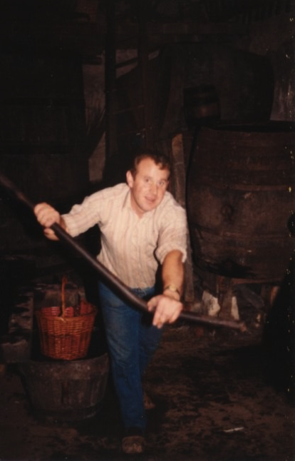 Marcel explique : " On ramasse les raisins, on les met en cuve, on les écrase (peau et grains) pendant 4 jours (chaque jour on revient faire ce travail). Ensuite on tire le jus qui a fermenté, on le met en tonneaux. On récupère le " gène ", on le remet dans le pressoir; le jus qui s'écoule sera versé dans le tonneau du départ. Après, on coupe les bordures qui dépassent du pressoir avec une " françoise " et on remet ces débris dans le pressoir. Le moût, bien sec, servira à faire de l'eau de vie. Une fois le vin dans le tonneau, je cueille des feuilles de vignes, je les croise, je les pose sur l'ouverture du tonneau, je mets du sable pour les fixer : ainsi le gaz de la fermentation pourra s'évacuer. En novembre, lorsqu'il n'y a plus de gaz (le vin ne " chante "plus), je mets le tapon fermant ainsi le tonneau ".